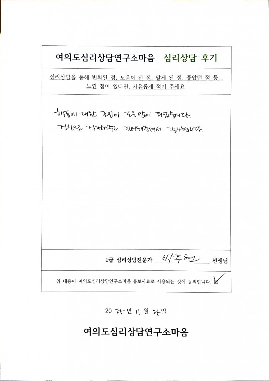박주현 선생님 심리상담 후기입니다.