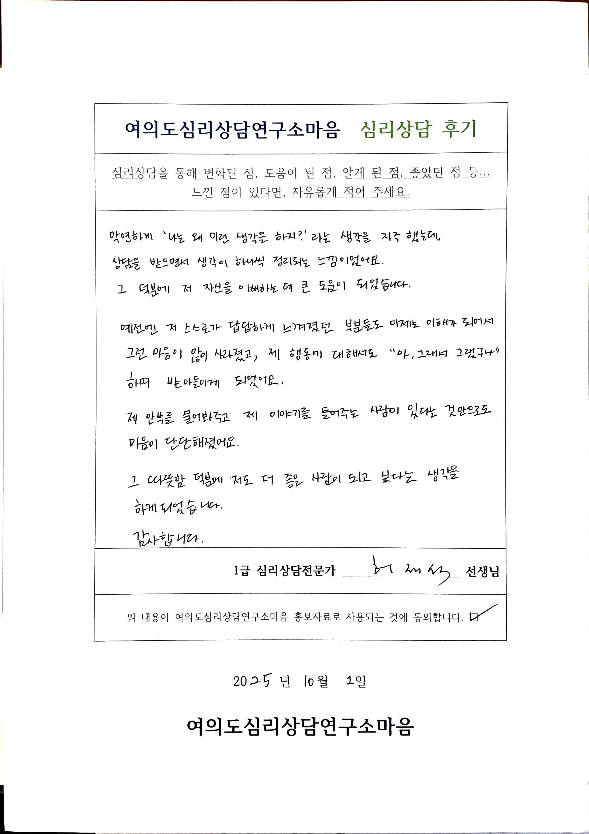 허재석 심리상담전문가 상담후기 입니다.